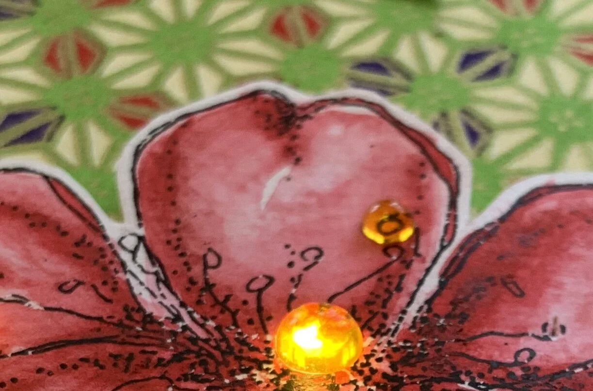 *scotch tape the wires down, making sure to curl them into a flat circle-and not bending them. Next add a double layer of foam tape around the circumference of the backside of the cherry blossom-but not on top of the EZ-Light. Adhere to the lower right corner of the card front.
