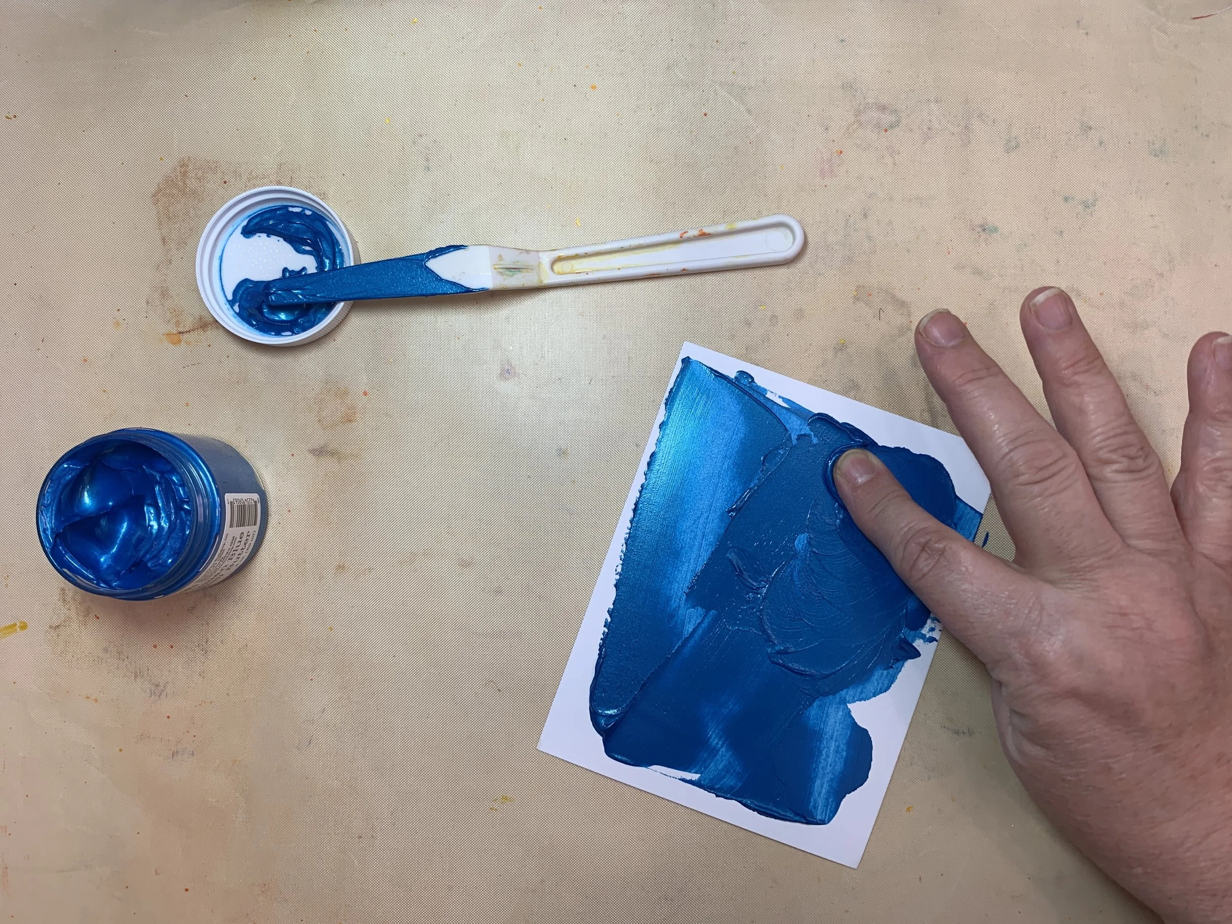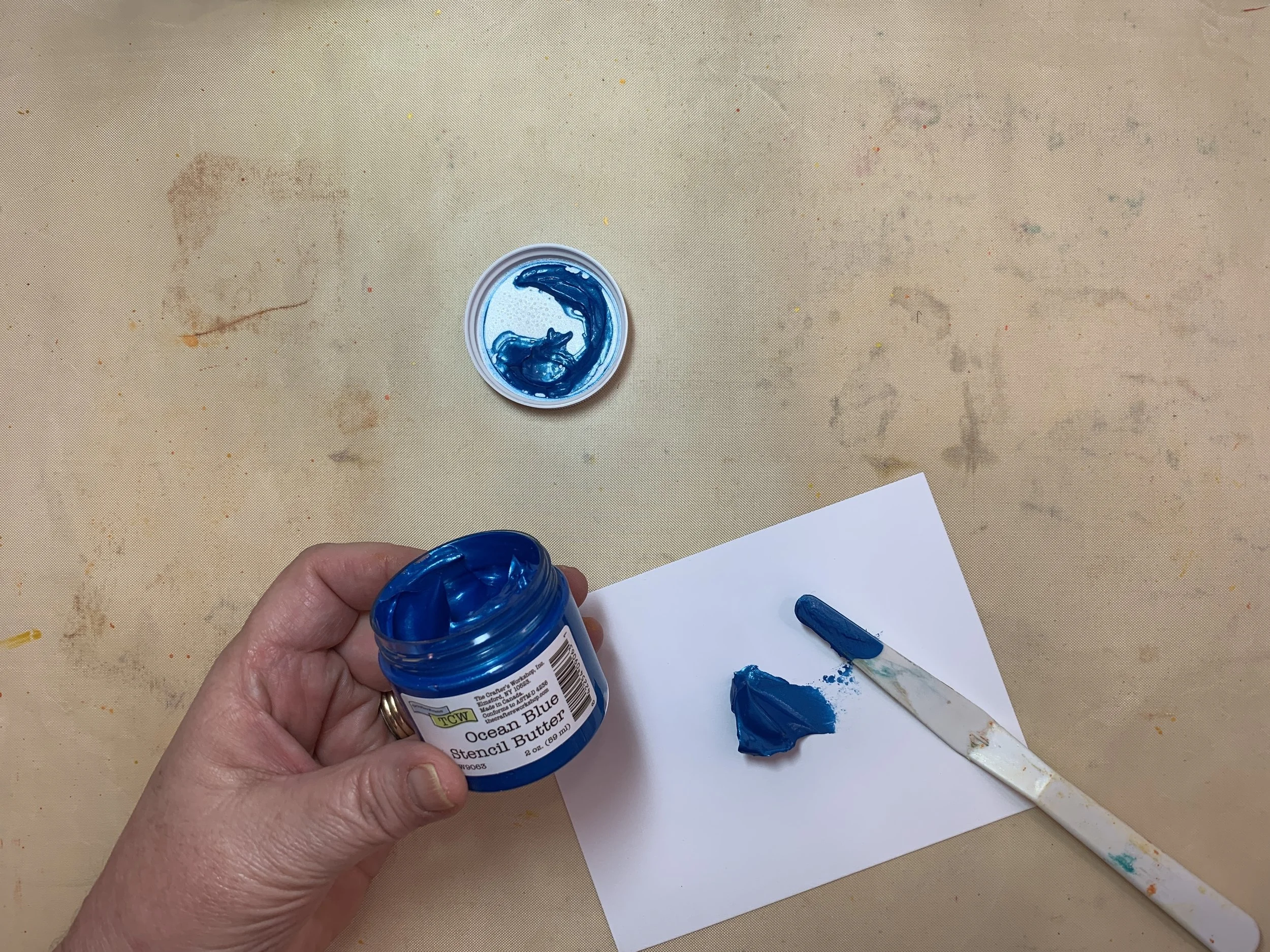 I start with a pre-cut piece of white cardstock, a palette knife and some Ocean Blue stencil butter. I add a bit of stencil butter to my cardstock with my palette knife, scrapping off excess back into the jar. (never waste color)